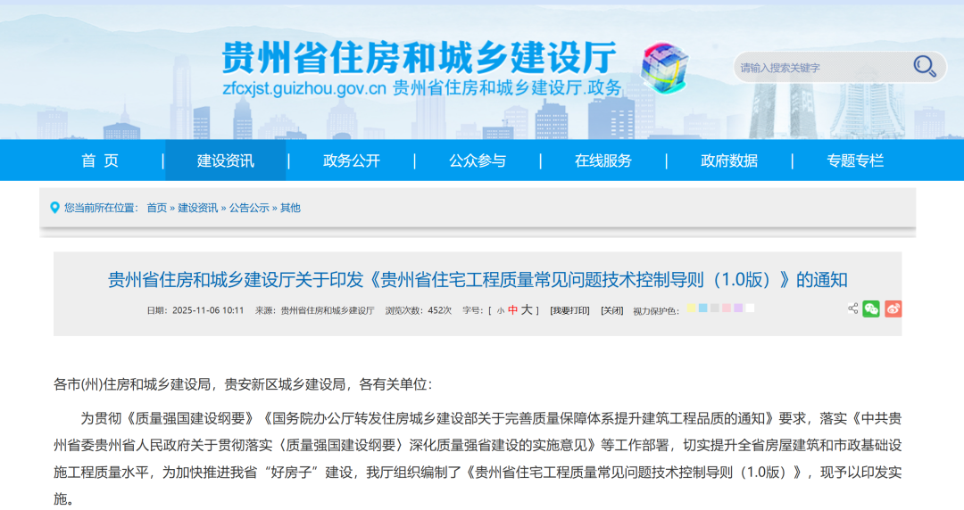 贵州发布住宅工程质量控制导则!地下室、外墙、屋面等部位防渗漏技术方案出炉!发表时间:2025-12-26 11:08 ![]() 《导则》结合贵州实际,针对住宅渗漏、墙体开裂等群众关切的质量痛点,以及住房城乡建设部重点整治方向编制,标志着该省住宅质量管控从 “事后整改” 转向 “事前预防、事中控制”。其适用范围覆盖省内新建、扩建、改建的房屋建筑住宅工程,内容贯穿住宅建设全流程,涵盖地基基础、磷石膏应用、渗漏防治等 14 个关键领域,还结合贵州山区特点强化针对性技术措施,如破解磷石膏墙体开裂难题。 《导则》实操性突出,不仅描述质量问题现象与成因,还提供施工规范、防治方案,图文结合便于一线人员执行,例如针对渗漏明确关键部位控制原则与工序要求。 为推动落地,贵州省住建厅要求各市(州)住建主管部门等相关单位组织学习宣贯,并将其纳入工程质量监督、验收等工作,对违规单位严肃处理。《导则》实施将为贵州住宅工程提供统一技术依据,减少质量通病、保障住房安全与功能,推动住宅建设从 “有没有” 向 “好不好” 转变,未来还将结合实践修订完善。 ![]()