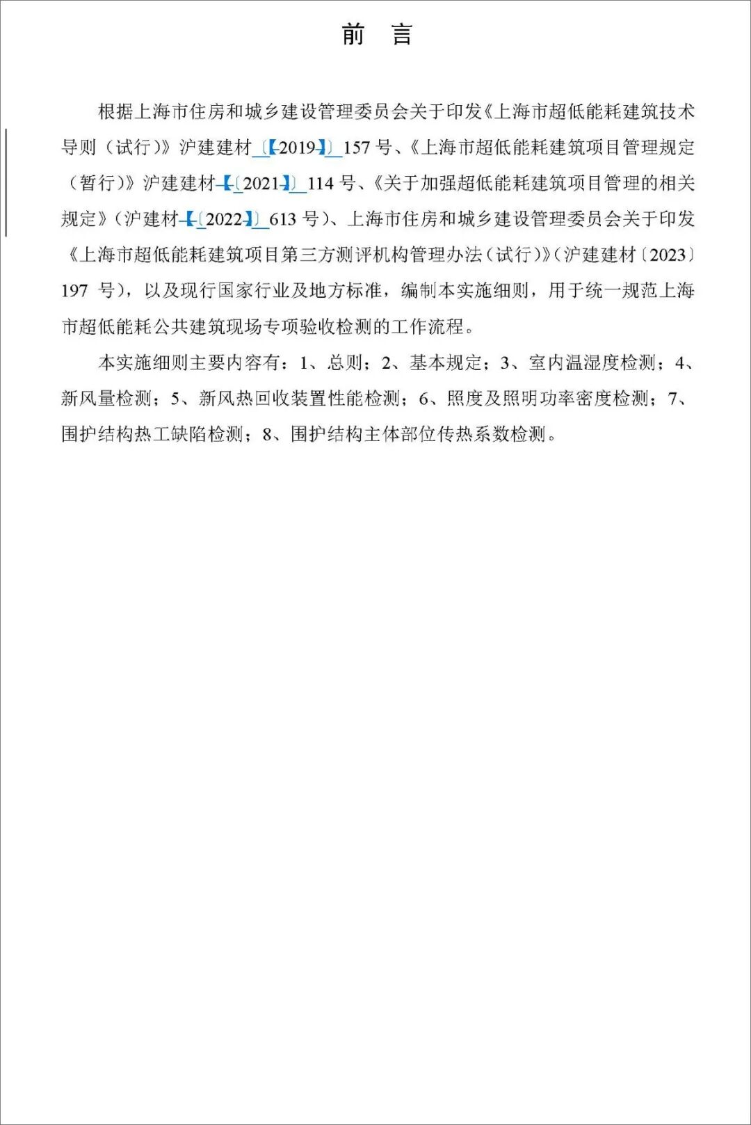《超低能耗公建现场检测实施细则、测评指导书》发布发表时间:2025-11-03 08:53 上海市住房和城乡建设管理委员会 关于印发《上海市超低能耗公共建筑现场专项检测实施细则》和《上海市超低能耗建筑第三方测评机构(公共建筑)测评指导书》的通知沪建建材〔2025〕356号 各有关单位: 为进一步完善超低能耗公共建筑测评工作,根据《上海市超低能耗建筑项目管理规定(暂行)》(沪建建材〔2021〕114号)《上海市超低能耗建筑项目第三方测评机构管理办法(试行)》(沪建建材〔2023〕197号)等文件,我委修订形成了《上海市超低能耗公共建筑现场专项检测实施细则》和《上海市超低能耗建筑第三方测评机构(公共建筑)测评指导书》。现印发给你们,请遵照执行。 2025年7月11日 《上海市超低能耗公共建筑现场专项检测实施细则》 ![]() ![]() ![]() ![]() ![]() ![]() ![]() ![]() ![]() ![]() ![]() ![]() 《上海市超低能耗建筑第三方测评机构(公共建筑)测评指导书》 ![]() ![]() ![]() ![]() ![]() ![]() ![]() ![]() ![]() ![]() ![]() ![]() ![]() ![]() ![]() |