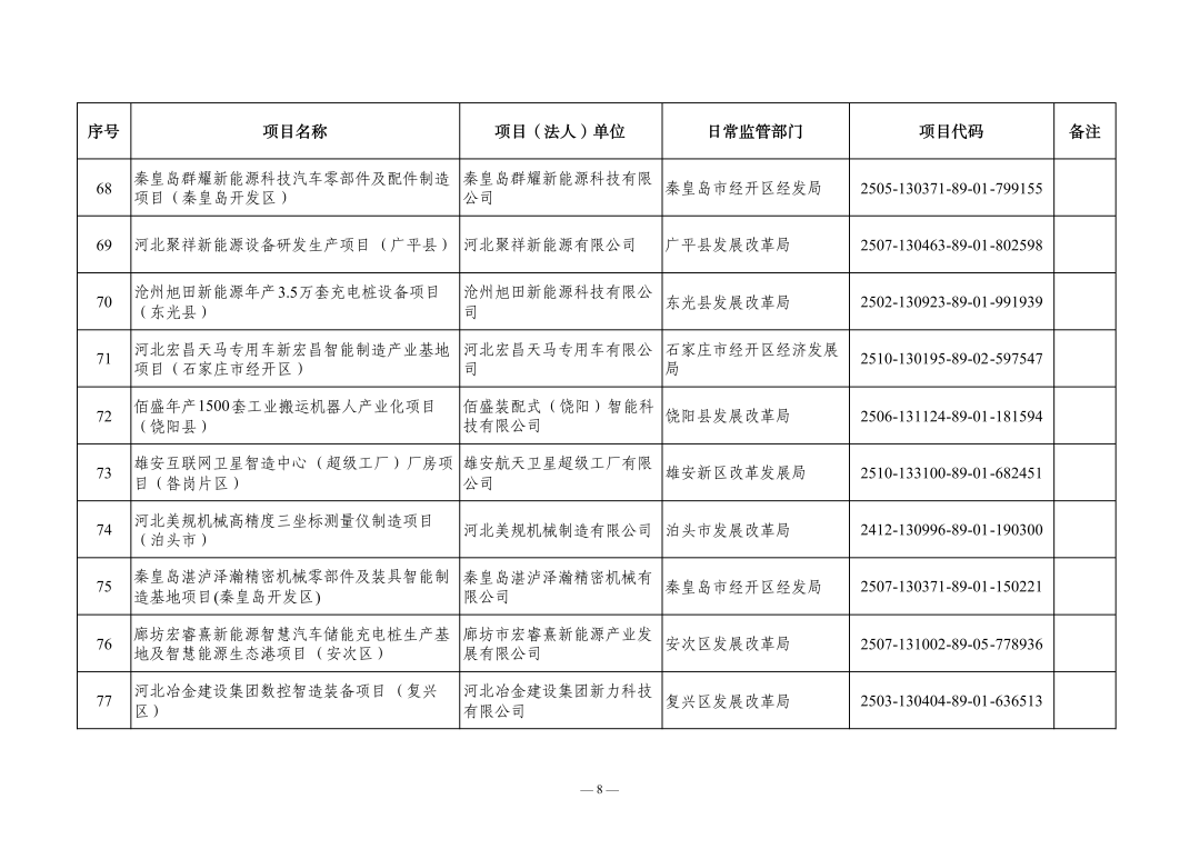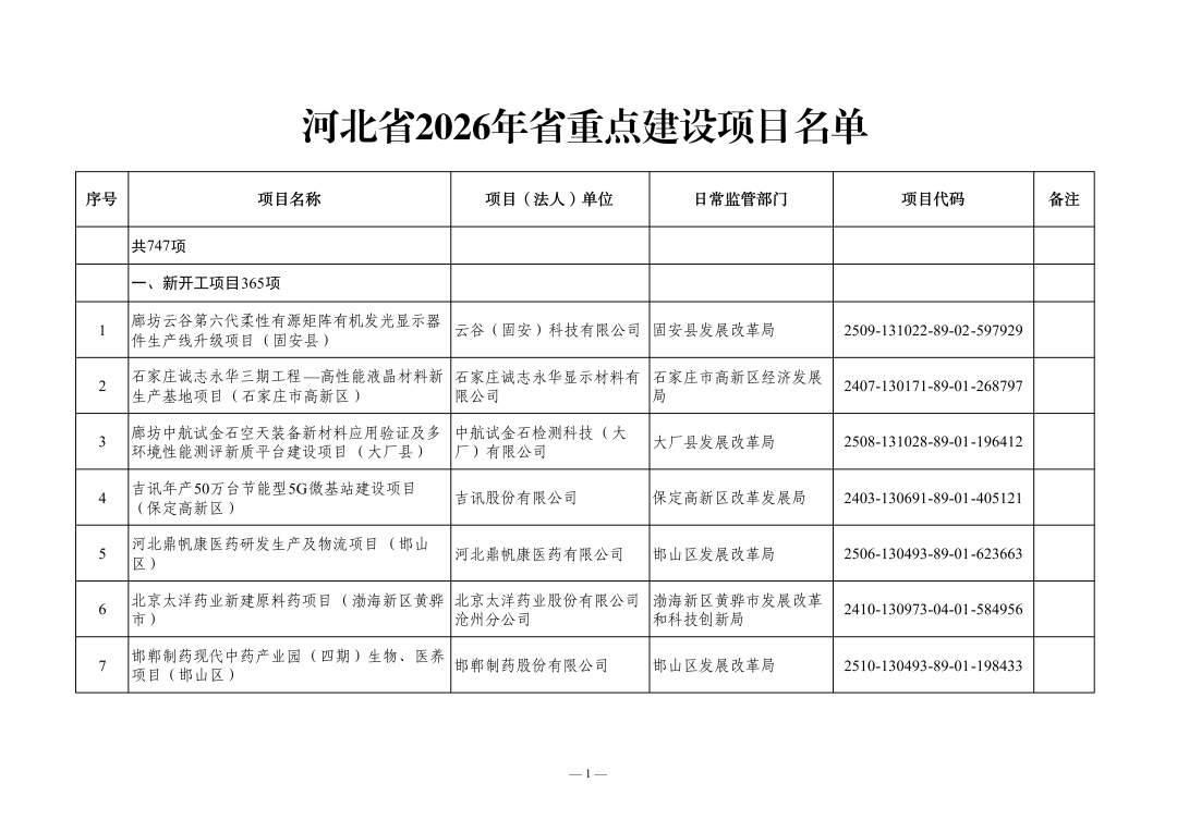 总投资1.56万亿元!2026年河北省重点建设项目名单公布发表时间:2026-01-08 13:34 ![]() 各市(含定州、辛集市)人民政府,雄安新区管委会,省有关部门: 河北省2026年省重点建设项目名单已经省政府同意,现予印发。项目共计747项,总投资1.56万亿元,有关要求如下: 一、建立项目清单台账。分区域、分行业逐项明确目标、完成时限和责任单位,细化项目投资任务,1月20日前通过省重点建设项目调度平台逐项提交清单台账。同时,加快编制市级重点建设项目名单,印发后向我委报备。 二、实施全过程管理。各地、各部门每月对本区域、本行业重点项目进行调度,通过对账、交账、算账,实施全过程管理。我委定期调度重点项目建设情况和省重点前期项目储备情况。 三、加强要素保障。实行重点项目用地保障台账管理,新增建设用地计划指标向重点项目倾斜。建立常态化银企对接机制,定期组织项目单位和金融机构开展线上线下对接。强化环保政策支持,保障项目建设施工。优化用能配置,优先支持符合条件的重点项目用能需要。 四、加强监督管理。日常监管责任单位要明确项目监管责任人,及时发现、反映、解决项目建设中的困难和问题,认真做好项目建设情况汇总分析,按照统计上报工作要求,每月10—15日,通过省重点建设项目调度平台,及时准确填报上月项目建设信息。 附件:河北省2026年省重点建设项目名单 ![]() ![]() ![]() ![]() ![]() ![]() ![]() ![]() ![]() |
