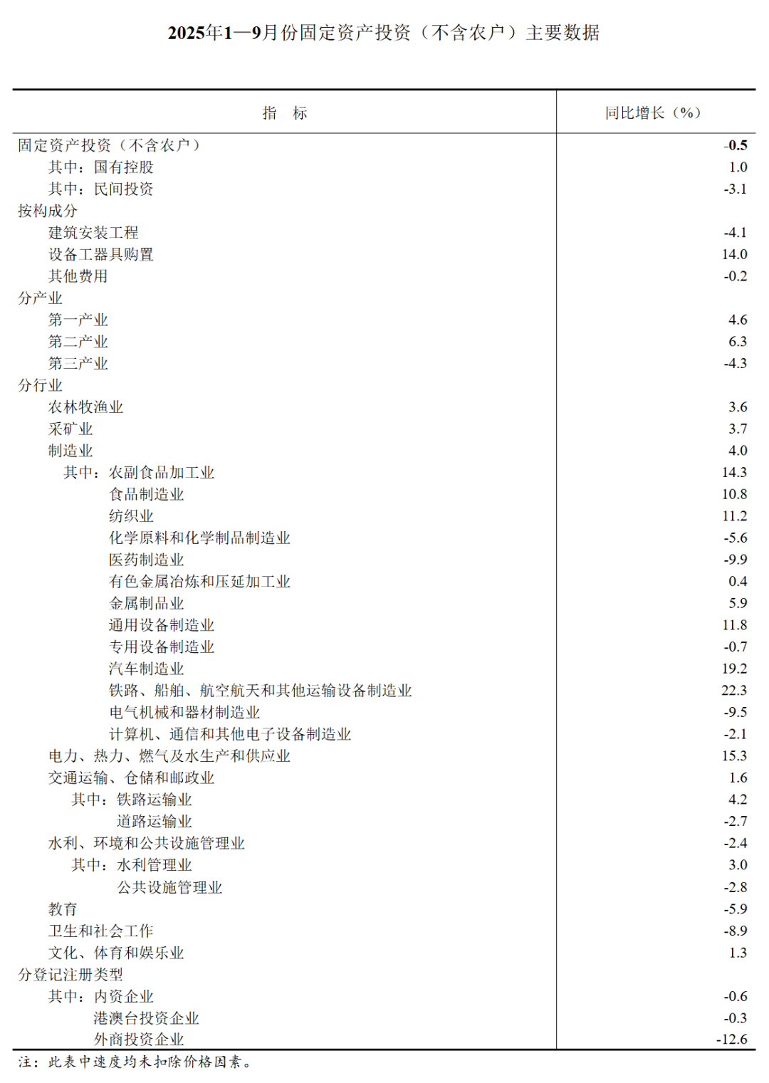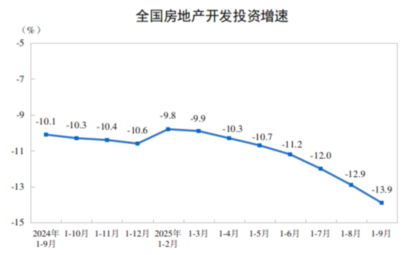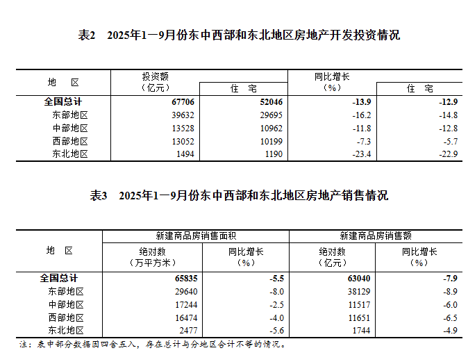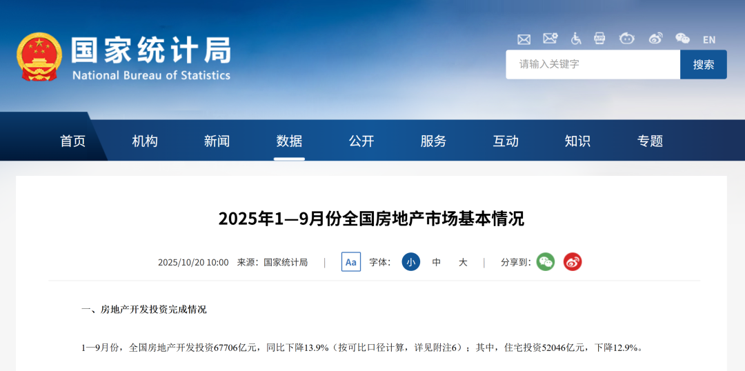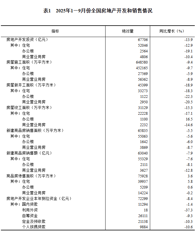 1-9月份全国房地产市场基本情况出炉!房地产市场仍然朝着止跌回稳的方向迈进!发表时间:2025-11-15 11:00 ![]() 一、房地产开发投资完成情况 1—9月份,全国房地产开发投资67706亿元,同比下降13.9%(按可比口径计算,详见附注6);其中,住宅投资52046亿元,下降12.9%。 ![]() 1—9月份,房地产开发企业房屋施工面积648580万平方米,同比下降9.4%。其中,住宅施工面积452165万平方米,下降9.7%。房屋新开工面积45399万平方米,下降18.9%。其中,住宅新开工面积33273万平方米,下降18.3%。房屋竣工面积31129万平方米,下降15.3%。其中,住宅竣工面积22228万平方米,下降17.1%。 二、新建商品房销售和待售情况 1—9月份,新建商品房销售面积65835万平方米,同比下降5.5%;其中住宅销售面积下降5.6%。新建商品房销售额63040亿元,下降7.9%;其中住宅销售额下降7.6%。 ![]() 9月末,商品房待售面积75928万平方米,比8月末减少241万平方米。其中,住宅待售面积减少292万平方米。 三、房地产开发企业到位资金情况 1—9月份,房地产开发企业到位资金72299亿元,同比下降8.4%。其中,国内贷款11294亿元,下降1.4%;利用外资18亿元,下降37.3%;自筹资金26111亿元,下降9.3%;定金及预收款21138亿元,下降10.3%;个人按揭贷款9884亿元,下降10.6%。 ![]() 四、房地产开发景气指数 9月份,房地产开发景气指数(简称“国房景气指数”)为92.78。 ![]() 五、固定资产投资 2025年1—9月份,全国固定资产投资(不含农户)371535亿元,同比下降0.5%(按可比口径计算)。其中,民间固定资产投资同比下降3.1%。从环比看,9月份固定资产投资(不含农户)下降0.07%。 ![]() 分产业看,第一产业投资7344亿元,同比增长4.6%;第二产业投资134063亿元,增长6.3%;第三产业投资230128亿元,下降4.3%。 第二产业中,工业投资同比增长6.4%。其中,采矿业投资增长3.7%,制造业投资增长4.0%,电力、热力、燃气及水生产和供应业投资增长15.3%。 第三产业中,基础设施投资(不含电力、热力、燃气及水生产和供应业)同比增长1.1%。其中,水上运输业投资增长12.8%,铁路运输业投资增长4.2%,水利管理业投资增长3.0%。 分地区看,东部地区投资同比下降4.5%,中部地区投资增长1.5%,西部地区投资增长1.5%,东北地区投资下降8.4%。 分登记注册类型看,内资企业固定资产投资同比下降0.6%,港澳台企业固定资产投资下降0.3%,外商企业固定资产投资下降12.6%。 ![]() ![]() ![]() |