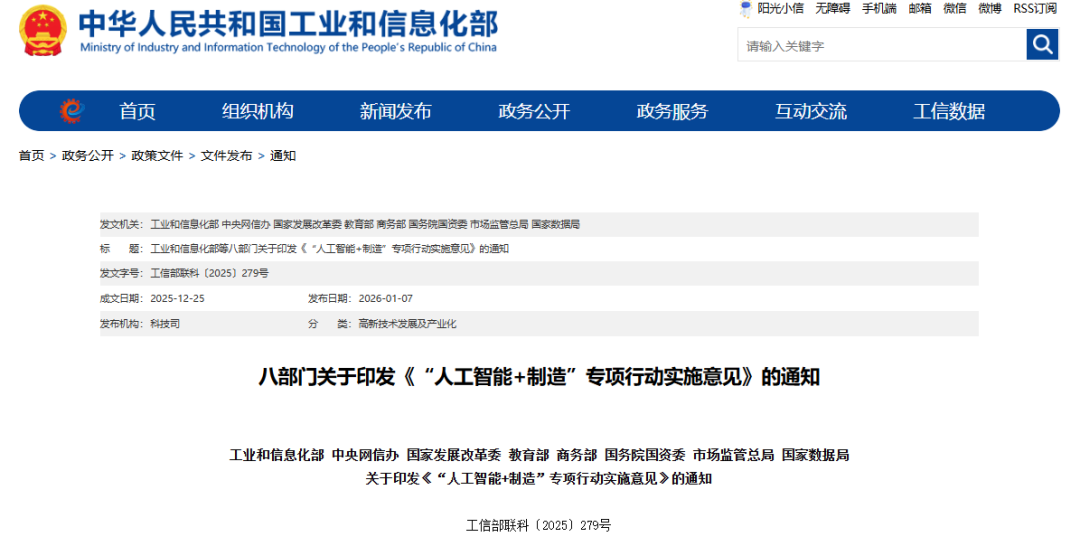 培育一批专精特新!八部门开展『人工智能+制造』专项行动发表时间:2026-01-09 08:26 ![]() 《意见》明确,到2027年,我国人工智能关键核心技术实现安全可靠供给,产业规模和赋能水平稳居世界前列。推动3-5个通用大模型在制造业深度应用,形成特色化、全覆盖的行业大模型,打造100个工业领域高质量数据集,推广500个典型应用场景。培育2-3家具有全球影响力的生态主导型企业和一批专精特新中小企业,打造一批“懂智能、熟行业”的赋能应用服务商,选树1000家标杆企业。建成全球领先的开源开放生态,安全治理能力全面提升,为人工智能发展贡献中国方案。 重点内容如下: 强化人工智能算力供给。推动智能芯片软硬协同发展,支持突破高端训练芯片、端侧推理芯片、人工智能服务器、高速互联、智算云操作系统等关键核心技术。有序推进高水平智算设施布局,加快建设算力互联互通平台、全国一体化算力网监测调度平台,开展智算云服务试点,推动大模型一体机、边缘计算服务器、工业云算力部署,提升智算资源供给能力。 开发高水平行业模型。支持模型训练和推理方法创新,开发适应制造业实时性、可靠性、安全性特点的高性能算法模型。培育重点行业大模型,发展“云-边-端”模型体系,持续提升泛化能力。 加快重点行业应用赋能。加快赋能原材料、装备制造、消费品、电子信息、软件和信息技术服务等制造业相关重点行业,加快标杆解决方案和经验推广应用。 提升重点企业应用水平。鼓励龙头企业、央国企等先行先试,提供规模化应用场景,先行探索人工智能赋能制造业的新模式新应用。深入实施中小企业数字化赋能专项行动,支持中小企业开展数字化、智能化改造,加快中小企业人工智能应用复制推广。 推进重点区域推广应用。发挥国家人工智能创新应用先导区作用,建设并开放一批“人工智能+制造”应用场景,打造具备行业特色的创新高地。 推动智能装备迭代。加快人工智能赋能工业母机、工业机器人,研制新一代人工智能数控系统,提升自主决策、分析和执行等能力。加快发展手术机器人、智能诊断系统等,加速智能医疗装备产品创新和临床应用推广。推动人工智能技术融入大飞机、船舶等重大技术装备研发、制造、运行,发展无人机等智能低空装备。开展搭载自动驾驶功能的智能网联汽车产品测试与安全评估,有序推进产品准入和上路通行试点。 打造创新载体。布局一批人工智能领域重点实验室,加强对类脑智能、世界模型等前沿技术探索。 ![]() |
